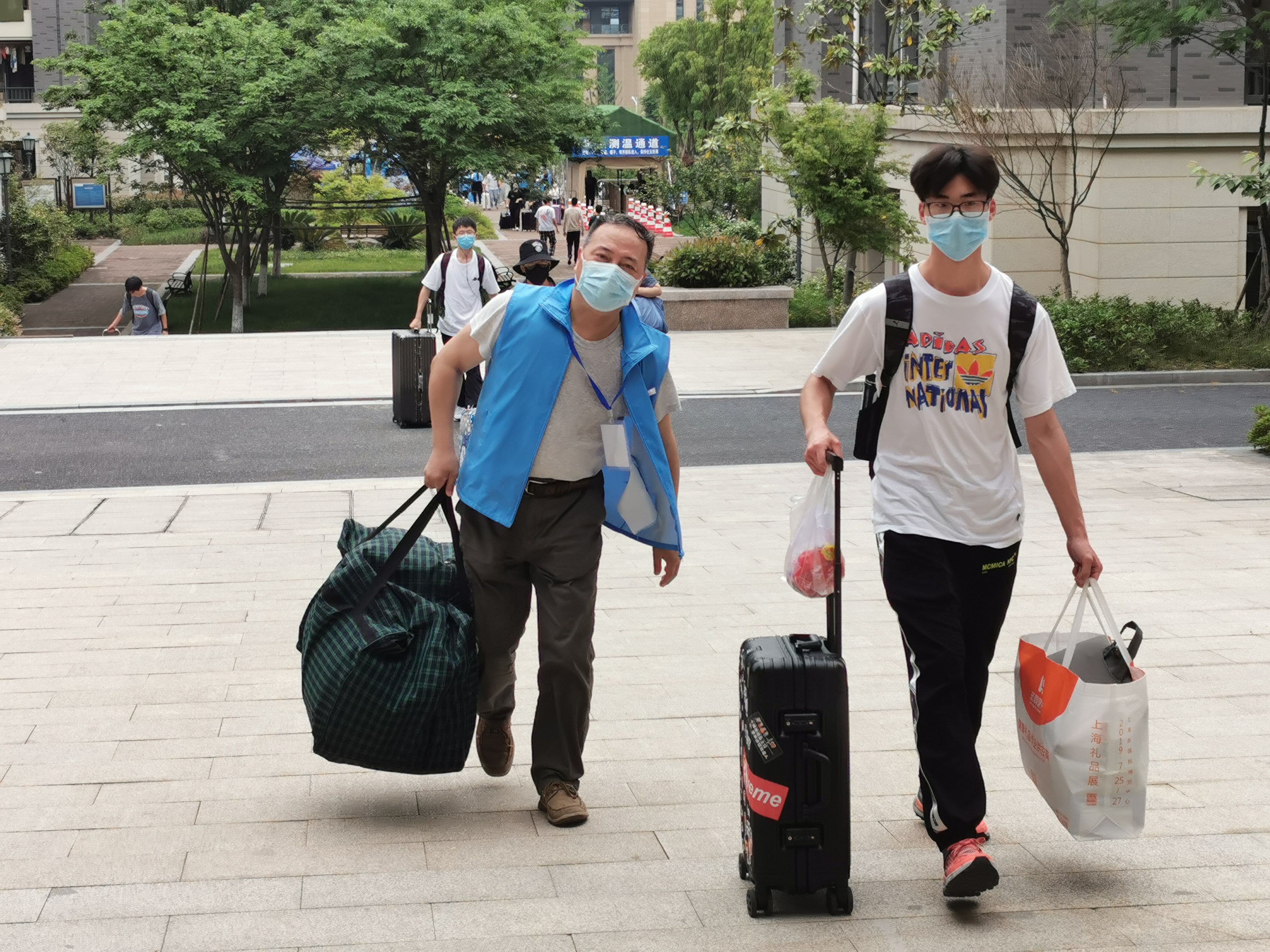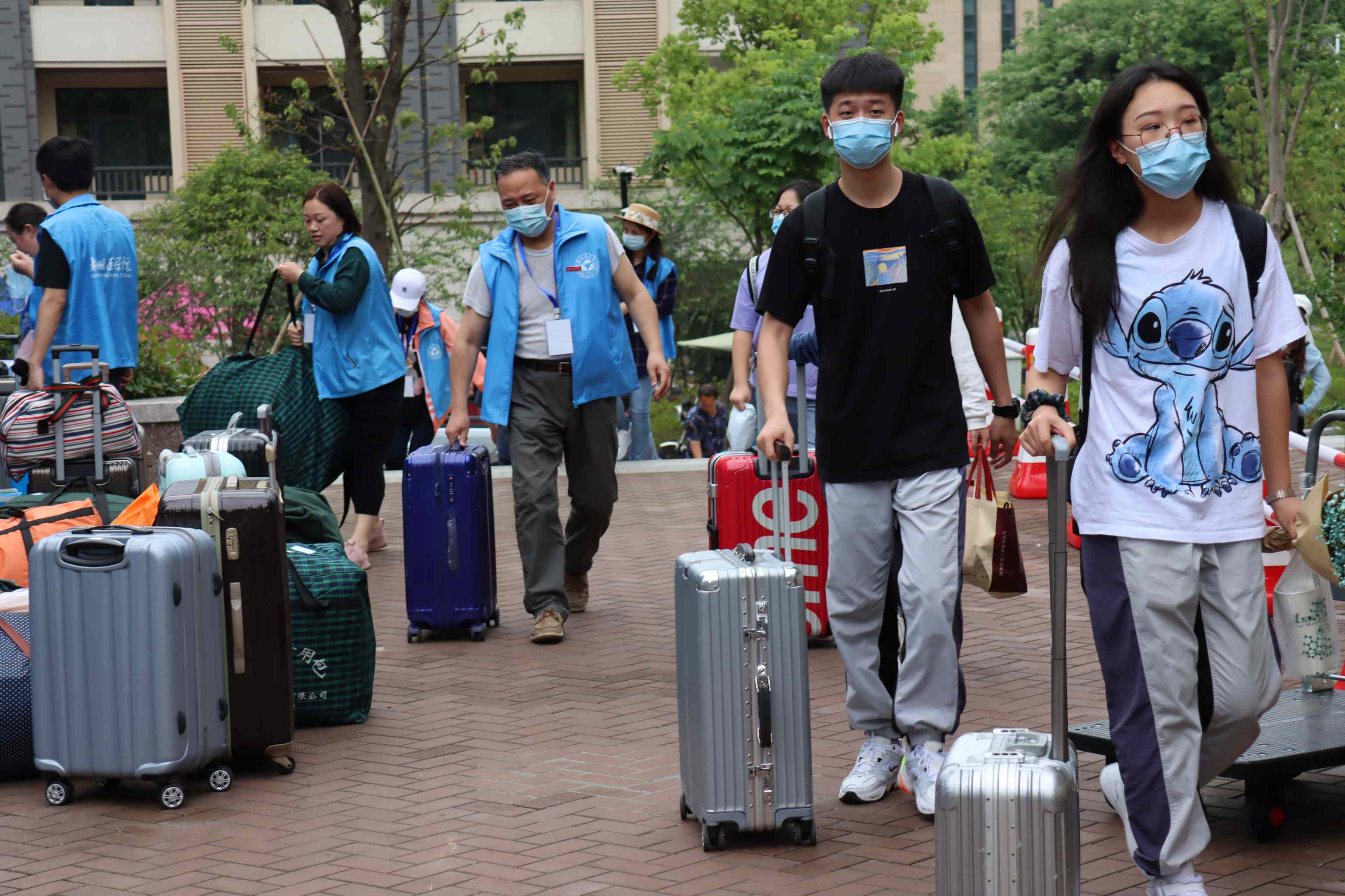 校门口,班主任、辅导员们殷切等待着班里的孩子们。同学们一下车,手上的行李会瞬间被围上的老师志愿者接走。扛上行李的老师们还不忘嘱咐: