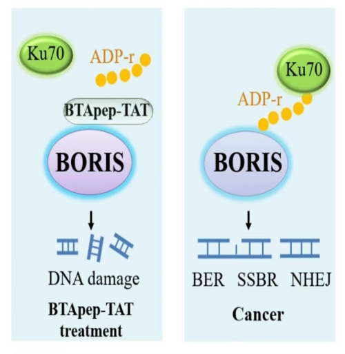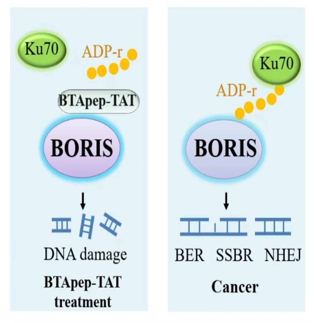 课题组经过努力,筛选出了特异性结合且抑制BORIS功能的多肽BTApep-TAT。BTApep-TAT结合BORIS的N端氨基酸,诱导癌细胞凋亡和DNA损伤,并缓解非小细胞肺癌的发生发展。在此基础上,课题组利用BTApep-TAT研究了BORIS对癌细胞DNA损伤修复的功能。课题组发现BORIS可促进癌细胞中的单链或双链DNA损伤修复,而BTApep-TAT对BORIS的抑制导致癌细胞DNA损伤。进一步研究发现,BORIS蛋白198-228AA区段内的核糖基化修饰响应癌细胞中DNA的损伤,BORIS的核糖基化募集Ku70参与修复细胞内的DNA的损伤。BORIS蛋白198-228AA区段内谷氨酸上的核糖基化是修复癌细胞中DNA损伤的关键原因。BTApep-TAT对BORIS 198-228AA区段内谷氨酸上核糖基化修饰的抑制是杀伤癌细胞的主要原因。