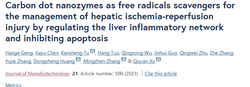 2023年12月22日,日韩欧美福利视频_黑人巨大人精品欧美三区_欧美成人另类人妖_欧美在线精品一区二区三区_欧美一区二区三区性视频_日韩精品欧美视频_性欧美极品xxxx欧美一区二区许秋然课题组在国际权威期刊《Journal of Nanobiotechnology》(中科院TOP一区,IF=10.2)发表题为“Carbon dot nanozymes as free radicals scavengers for the management of hepatic ischemia-reperfusion injury by regulating the liver inflammatory network and inhibiting apoptosis”的研究论文。该研究设计了一种具有类似SOD活性的碳点(C-dots)纳米酶,作为自由基清除剂,可以保护肝脏免受ROS介导的HIRI炎症反应和细胞凋亡的影响,从而提高治疗效果。许秋然研究员作为论文的末位通讯作者,日韩欧美福利视频_黑人巨大人精品欧美三区_欧美成人另类人妖_欧美在线精品一区二区三区_欧美一区二区三区性视频_日韩精品欧美视频_性欧美极品xxxx欧美一区二区黄东胜教授及西安交通大学张明真教授、涂康生副研究员为论文共同通讯作者,双方共同指导的日韩欧美福利视频_黑人巨大人精品欧美三区_欧美成人另类人妖_欧美在线精品一区二区三区_欧美一区二区三区性视频_日韩精品欧美视频_性欧美极品xxxx欧美一区二区基础医学与法医学院硕士研究生耿浩格为论文第一作者,论文通讯单位为日韩欧美福利视频_黑人巨大人精品欧美三区_欧美成人另类人妖_欧美在线精品一区二区三区_欧美一区二区三区性视频_日韩精品欧美视频_性欧美极品xxxx欧美一区二区。