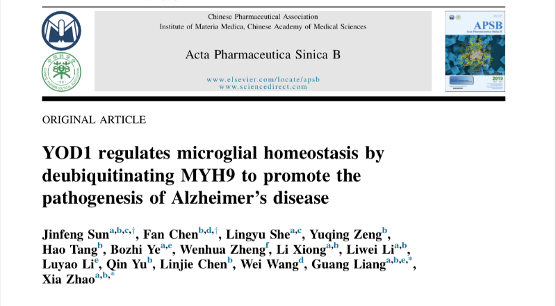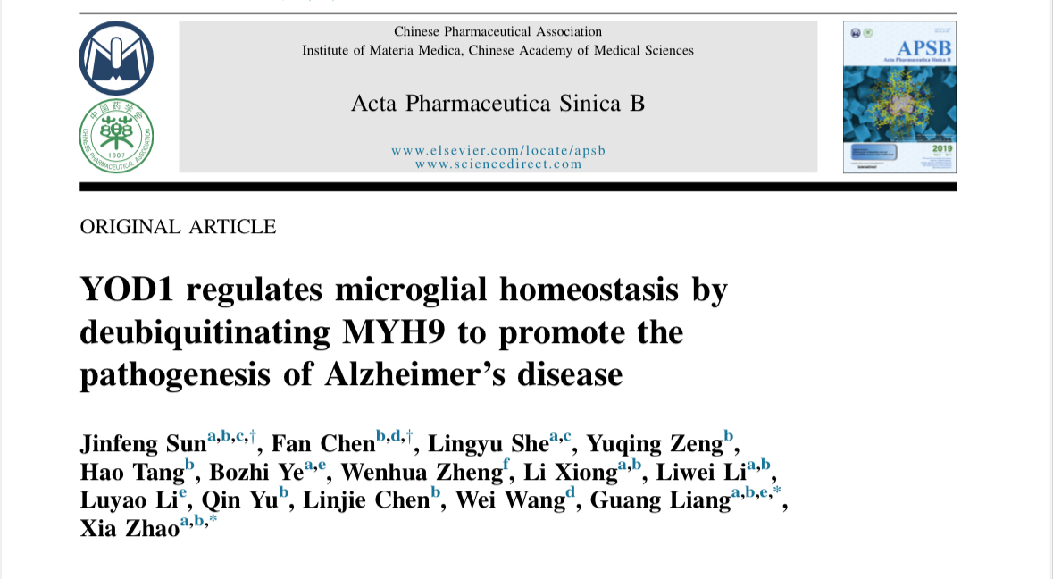 近日,我校梁广研究员创新团队赵霞课题组在杂志《Acta Pharmaceutica Sinica B》(中科院一区; IF=14.7)上在线发表了题为“YOD1 regulates microglial homeostasis by deubiquitinating MYH9 to promote the pathogenesis of Alzheimer's disease”的研究性论文。首次揭示了阿尔茨海默症病理条件下去泛素化酶YOD1对小胶质细胞稳态及神经元损伤的研究,解析了YOD1的结合底物及去泛素化修饰方式,提出了靶向小胶质细胞YOD1-MYH9信号轴治疗阿尔茨海默症的新策略。